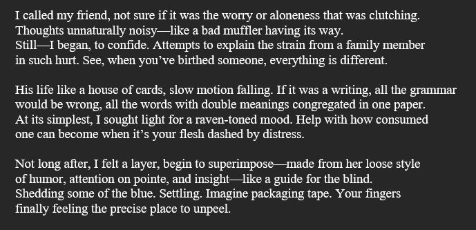 Elli Samuels is a poet living in Texas. Her writing has appeared in anthologies and journals such as Wingless Dreamer, Maudlin House, Pif Magazine, and Bones. She is a cookbook author (2014), a yogi, a runner, and is never without passion for gorilla watching, red ranunculus, or a stellar cup of coffee.